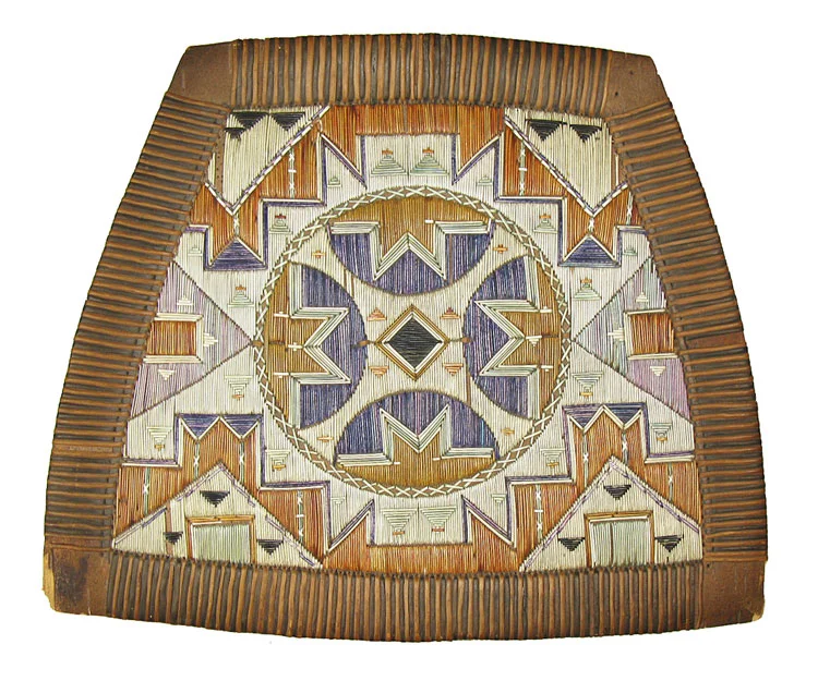 This chair seat incorporates iii techniques of bark insertion quillwork. The mosaic technique in which quills are laid side by side creates the primary pattern, with well-nigh of the quills laid vertically. The make full technique, which was used to fill up transition areas betwixt segments of the design, is evident in the cross-hatch stitches around the primal medallion and in concatenation stitches along borders between different geometric shapes. Finally, the overlay technique is present every bit small triangles worked over areas that were already solidly quilled behind them.